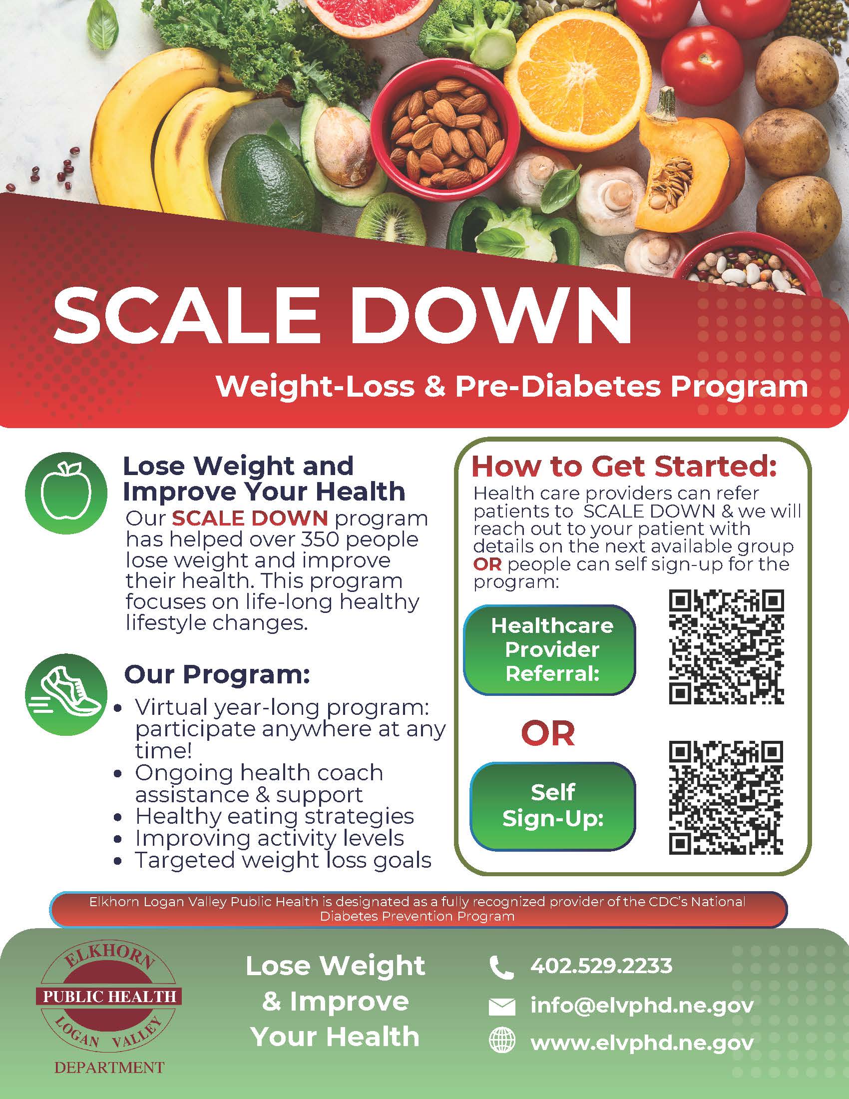 Scale Down Weight Loss Program: This is a year-long program and is based upon the National Diabetes Prevention Program. Making lifelong, sustainable healthy lifestyle changes is the goal of the program. We offer the SCALE DOWN program twice a year either virtually or in-person. See our SCALE DOWN program flyer for more details.