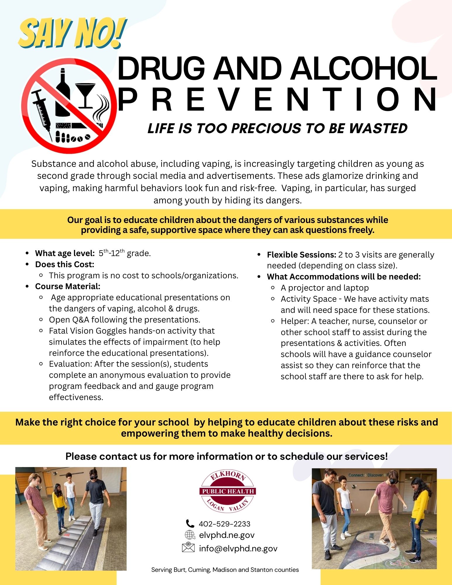 Elkhorn Logan Valley Public Health Department has several programs geared towards the prevention of drug and alcohol misuse and educating about the dangers of drugs, alcohol and vaping.